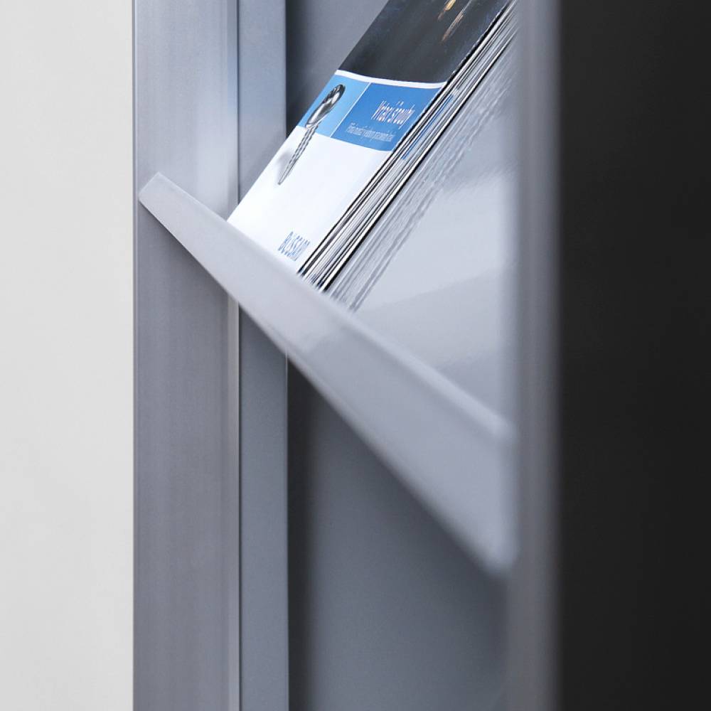 - 5 sloping brochure shelves in a high quality powder coated paint finish