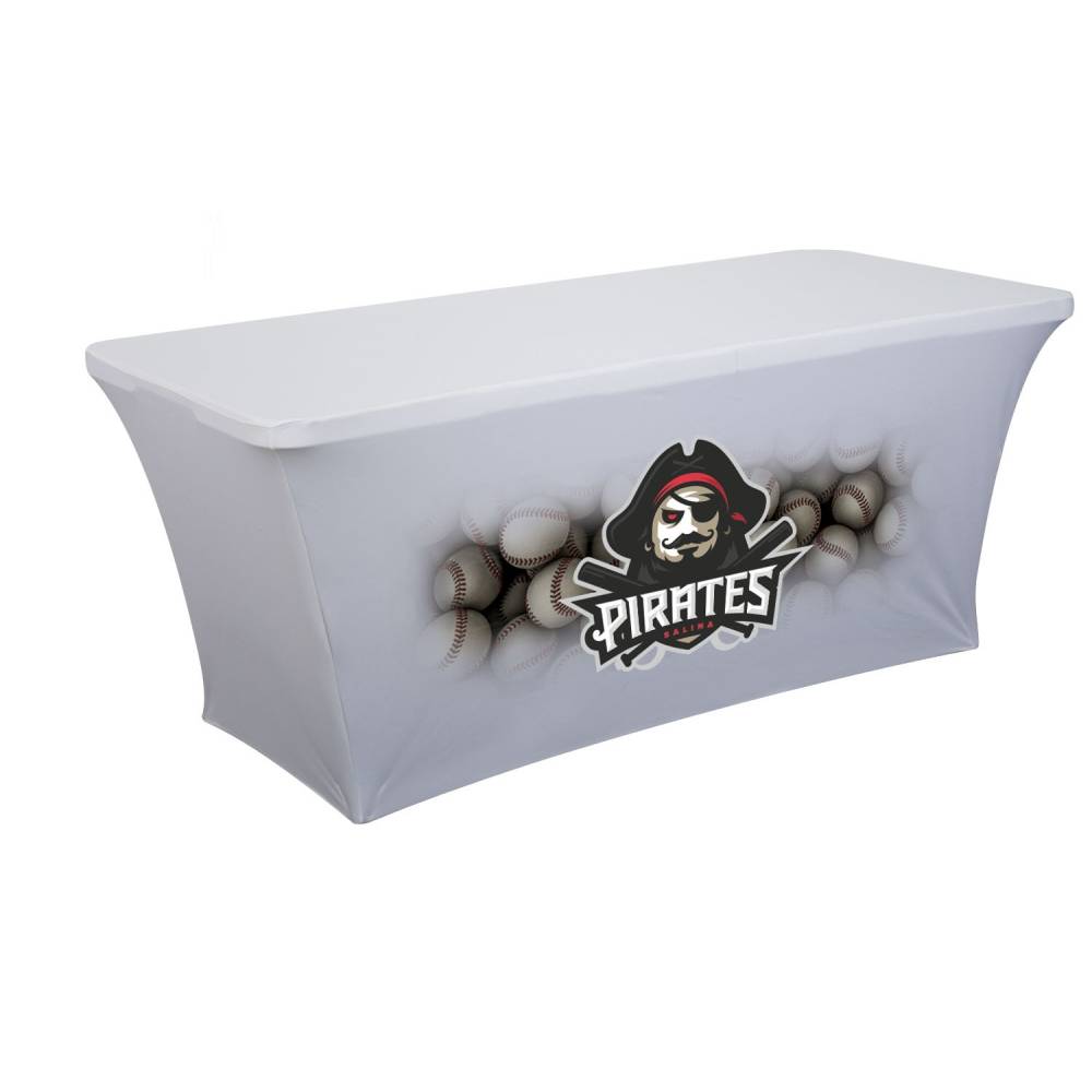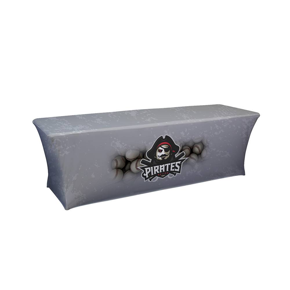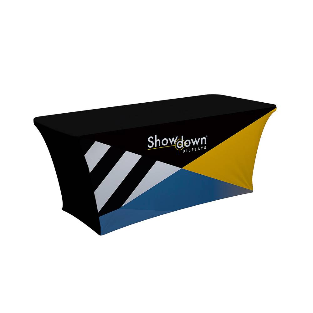 A tight and form-fitting table cover, an attractive option for promoting your brand. It stretches to fit tightly around tables, creating a crisp, refined appearance.